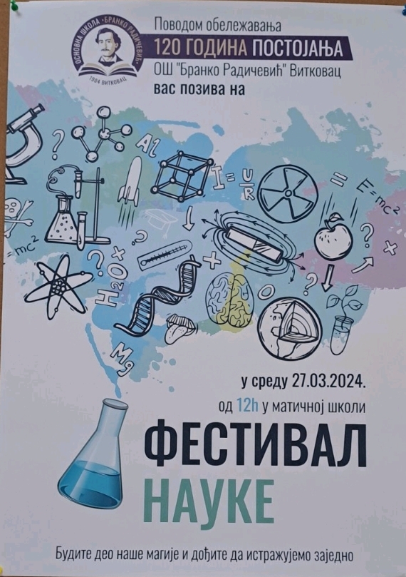 27.3.2024. у Основној школи „Бранко Радичевић“ у Витковцу организован је ,,Фестивал науке“ у част прослављања 120 година постојања школе. Директорка школе, Зорана Андрић, је упутила позив нашој школи, тако да су наши ученици у пратњи директорке, Данијеле Стефановић и наставнице физике, Лидије Петровић били активни учесници фестивала. У лепој атмосфери и амбијенту школе наши ученици су представили неколико занимљивих експеримената. Присутни гости и ученици имали су прилику да кроз многобројне огледе и радионице виде на примерима праксе све оно што се теоријски обрађује током часова редовне наставе физике, математике, хемије, технике и технологије и биологије.