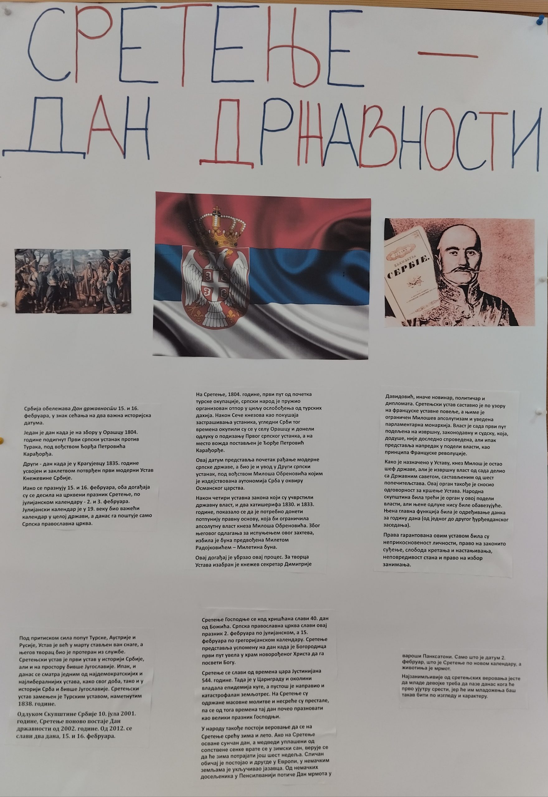 Србија ће 15. и 16. фебруара обележити Дан државности – Сретење. Овај празник је установљен у спомен на два важна догађаја у српској историји. Први, када је 1804. године у Орашцу подигнут Први српски устанак, и други када је 1835. у Крагујевцу издат први Устав Кнежевине Србије – Сретењски устав. У част овог празника, ученици осмог разреда са наставницом историје, Јеленом Јеросимић, припремили су плакате и презентацију за ученике и запослене наше школе.