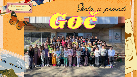 Настава у природи је реализована у периоду од 9.4.- 15.4.2024. године на Гочу. 68 ученика и 8 учитељица било је смештено у Дечјем одмаралишту ,,Гочко“. Шестодневни боравак на овој планини протекао је без већих проблема. Ученици су уживали у природи и сунчаном времену, шетали шумским стазама, пробали сремуш, научили много тога о сналажењу у простору. Поподне су проводили у школи и спортским активностима. Увече су се дружили у дискотеци, где су васпитачи били аниматори и организатори разних такмичења. Сарадња са управом и особљем хотела, докторком и васпитачима Оливером, Ненадом и Жељком је била одлична. Ученици су похваљени за културно и лепо понашање.